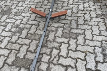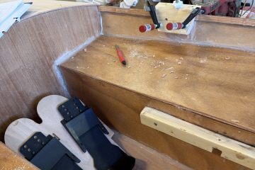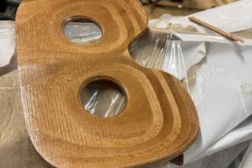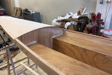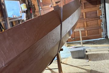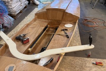 La duk på dekkene og påførte 2 strøk epoxy – må ha ett strøk til i morgen. Gårsdagens epoxy tas ut … Monterte utrigger for årene og skinnene.