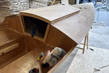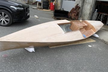 Malte et strøk til inni båten med hvit – fri fôr hvitmaling. Løfter inn fordekket og festet det – så bra ut. Trimmer av kanten på akterdekket med stikksag. Må pusses senere før glassfiber. Skjærte for bæring til skinnegang til Les mer