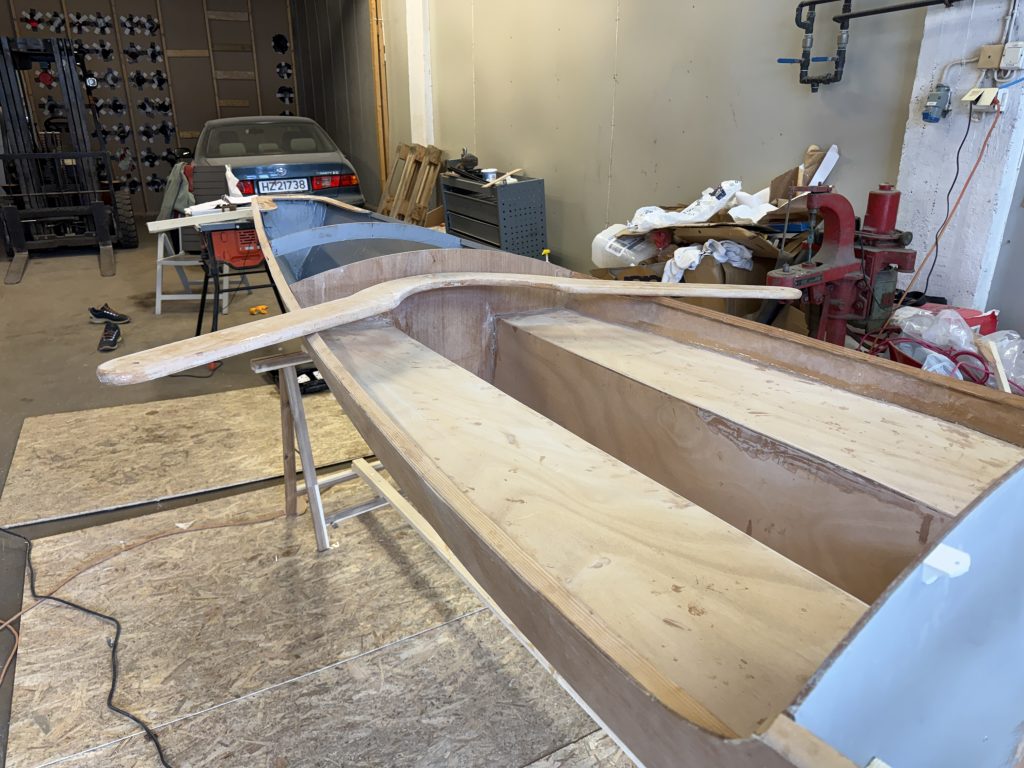 Tok ut båten og pusset litt før hvitmaling innvendig akter og forut. Prøvde utrigger – skal male den i dag.