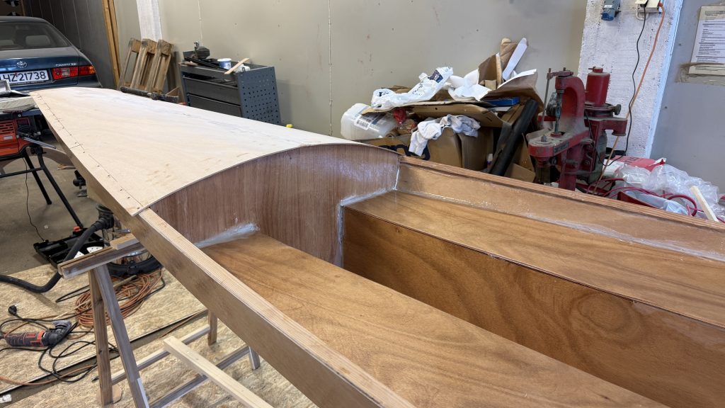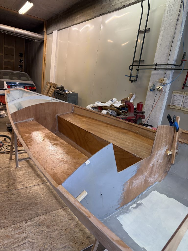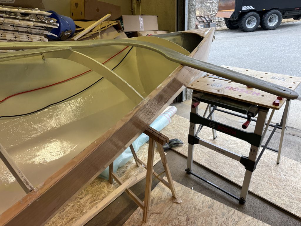 Epoxy på flytetankene og ymse. La på akterdekk og limte det og spikrer det fast med kobberspiker.